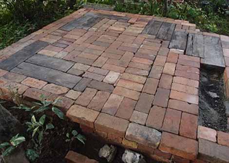 štrkopieskový vankúš, do ktorého vložíte ostatné tehly. Keď bude tento krok ukončený, zasypte povrch terasy suchým betónom (zmes piesku a cementu). Na obrázkoch vidíte stavbu terasy so starých tehál v kombinácií s drevenými podvalmi.