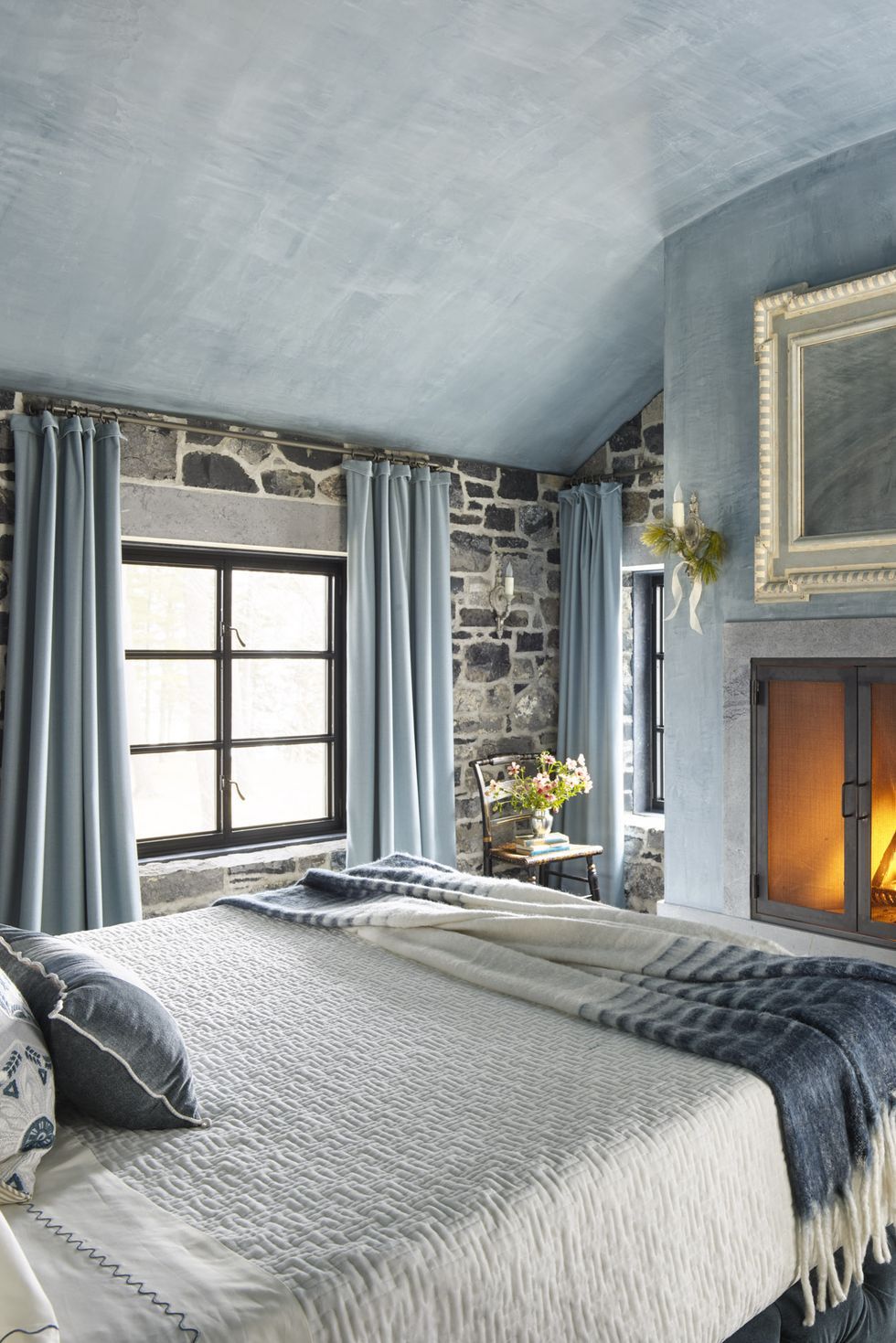Pre útulný pocit z chaty obložte stenu kameňom. V tejto primárnej spálni s jednofarebnými stenami použila dizajnérka rôzne kamene, aby miestnosti dodala zemitý, no zároveň moderný nádych.