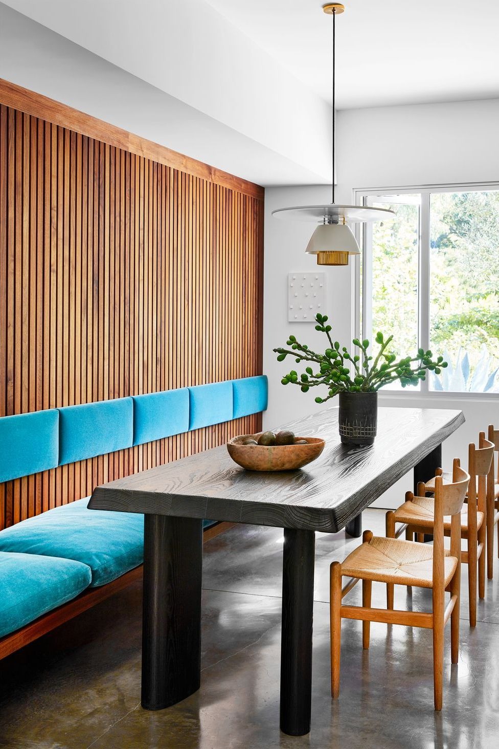 Tenké drevené obklady Tenké drevené obloženie z tmavého orecha na stene v tomto raňajkovom kútiku zjemňuje ostatné biele steny a mramorovú podlahu.