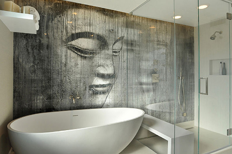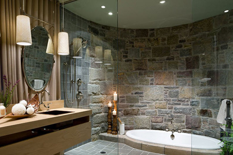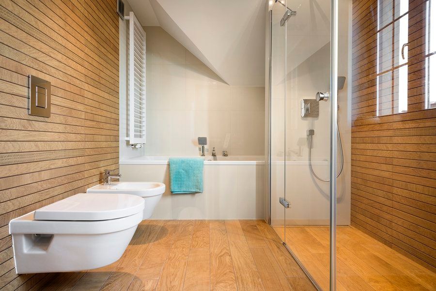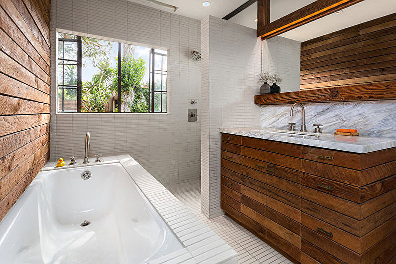 - Suchšie časti kúpeľne: drevo, umelý kameň alebo dizajnové panely