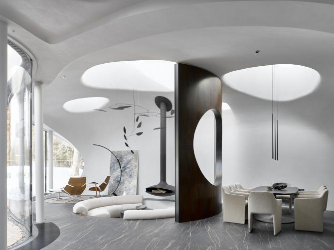Dodatočné spojenie s vonkajším priestorom je zabezpečené strešnými lampami orientovanými na pohyb slnka a dodávajúcim do vzduchu voľné svetlo a jemnú hru čiernych a bielych odtieňov. Futuristická architektúra ako prirodzené rozšírenie prírody. Základné riešenia interiéru sú princípom integrácie „domácej galérie“ do obytného priestoru.