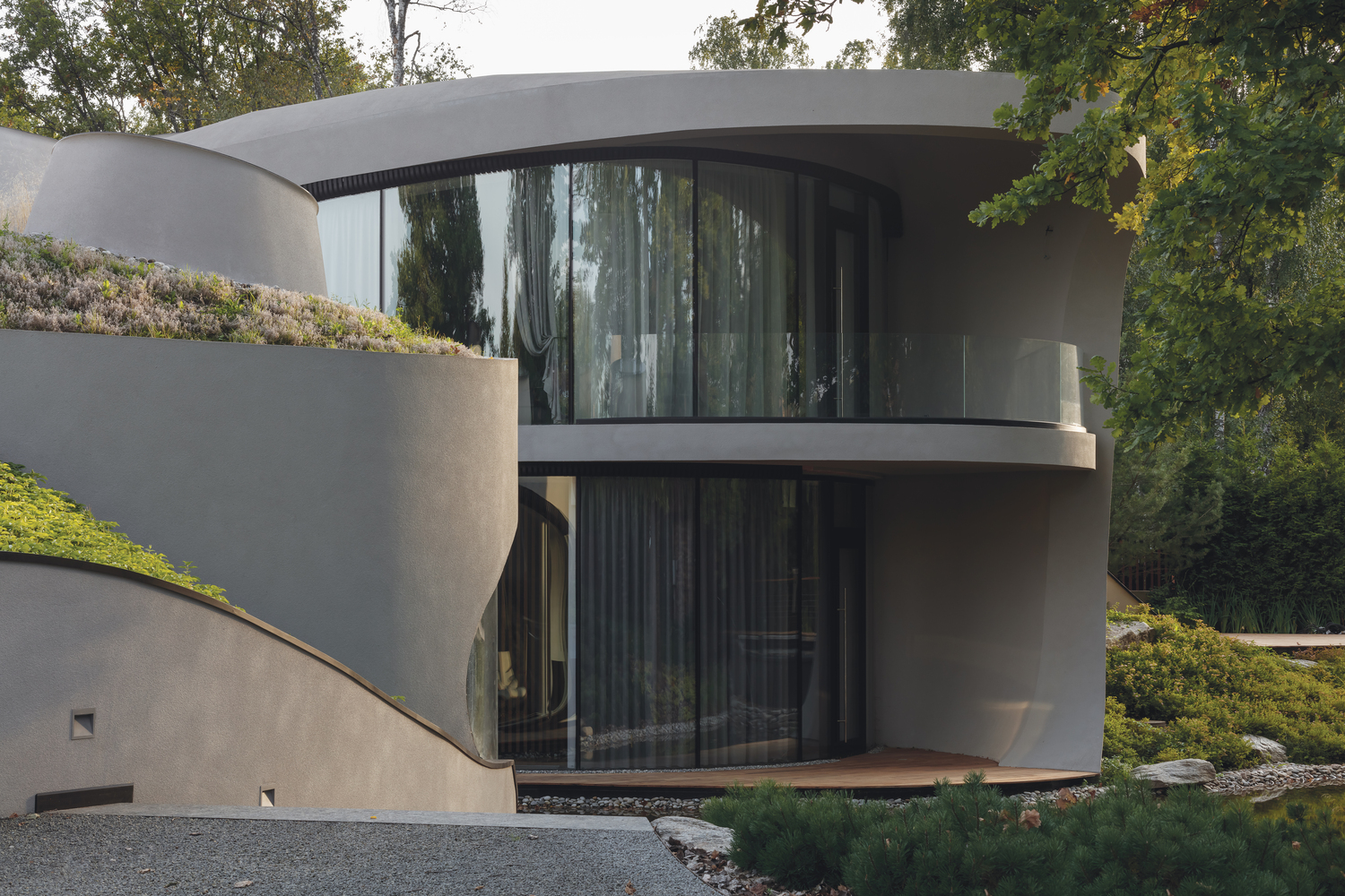 Všetko je vyvážené ako v živom organizme: vonkajší priestor objektu je pretkaný interiérom obývacej izby, spálne a ďalších miestností. Kontinuitu vzájomného toku krajiny do budovy a budovy do krajiny umocňuje zelená strecha, na ktorej sa organizuje záhrada s drevinami a bylinami a umelým reliéfom.