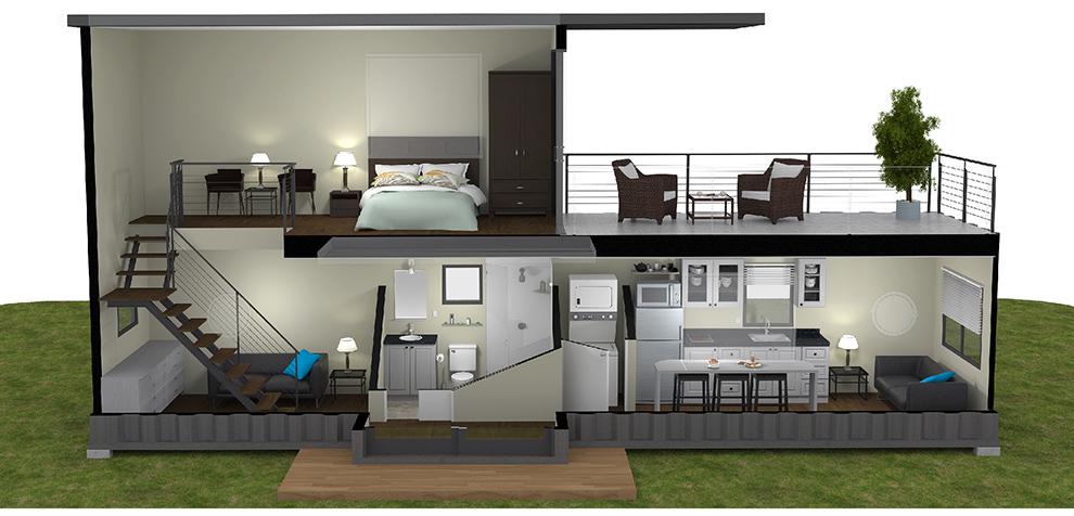 Najjednoduchší variant pozostáva s jediného kontajneru, zariadeného ako hosťovský domček pre návštevy. Zariadený minimalisticky, no funkčne.