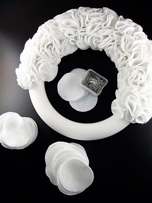 Veniec z kozmetických bavlnených tampónov. Postup je zrejmý z nasledujúcich obrázkov. Tampóny skladáme prehnutím na polovicu a potom na štvrtinu. Potom ho pomocou špendlíka pripevníme k základni. Biela v byte nič nepokazí.
