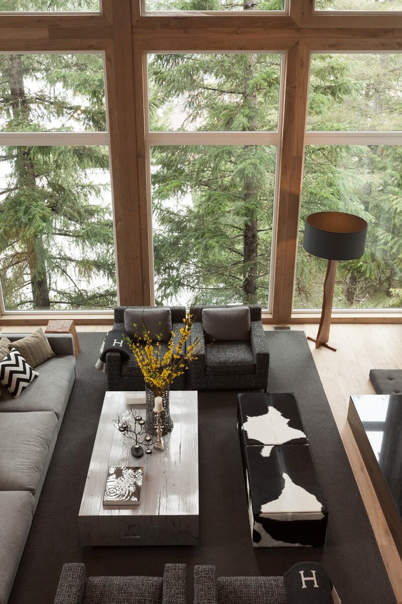 V obývacej izbe vidieckeho domu je celé prostredie preniknuté duchom prírody - nielen drevený nábytok, ale dokonca aj svietidlá v tvare hríbov. Dôležitú úlohu pri vytváraní obrazu priestrannej, svetlej, no zároveň pohodlnej miestnosti zohráva osvetľovací systém v podobe originálnych a krásnych závesných svietidiel.