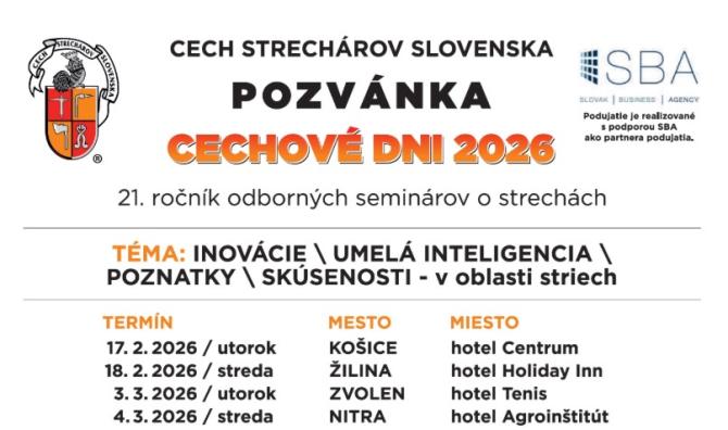 Cech strechárov Slovenska v spolupráci so svojimi partnerskými členmi si Vás dovoľuje pozvať na 21. ročník odborných seminárov. Stavebníctvo sa neustále vyvíja, preto sme program zostavili tak, aby prepojil dôležité teoretické poznatky s riešeniami pre každodennú prax.
