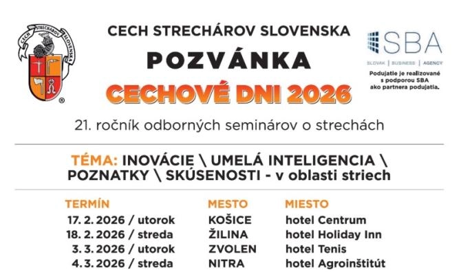 Krátky text: Cech strechárov Slovenska v spolupráci so svojimi partnerskými členmi si Vás dovoľuje pozvať na 21. ročník odborných seminárov. Stavebníctvo sa neustále vyvíja, preto sme program zostavili tak, aby prepojil dôležité teoretické poznat